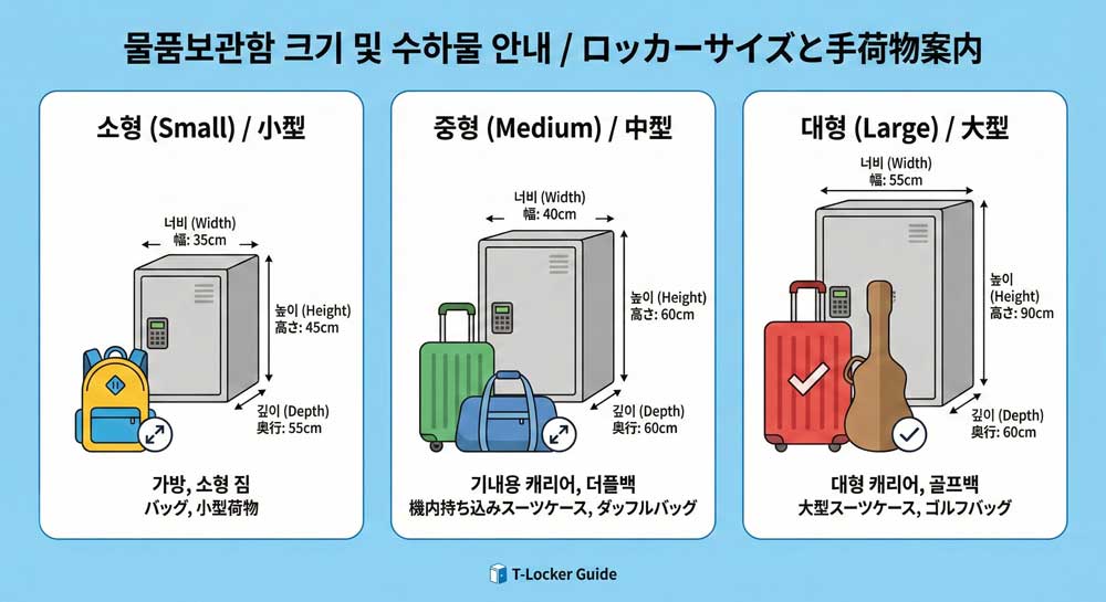 T-Locker施設は様々なタイプの荷物に対応するため、3つの異なるサイズを提供しています。料金体系を理解し、適切なサイズを選択することで、費用を節約し、荷物が適切に収まることを確認できます。